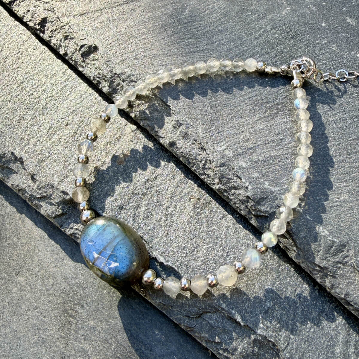 d’une grande perle centrale en labradorite (environ 1,8 x 1,3 cm), entourée de perles facettées en labradorite de tailles différentes.Pierres naturelles non traitées, sélectionnées pour leur éclat et leur vibration.