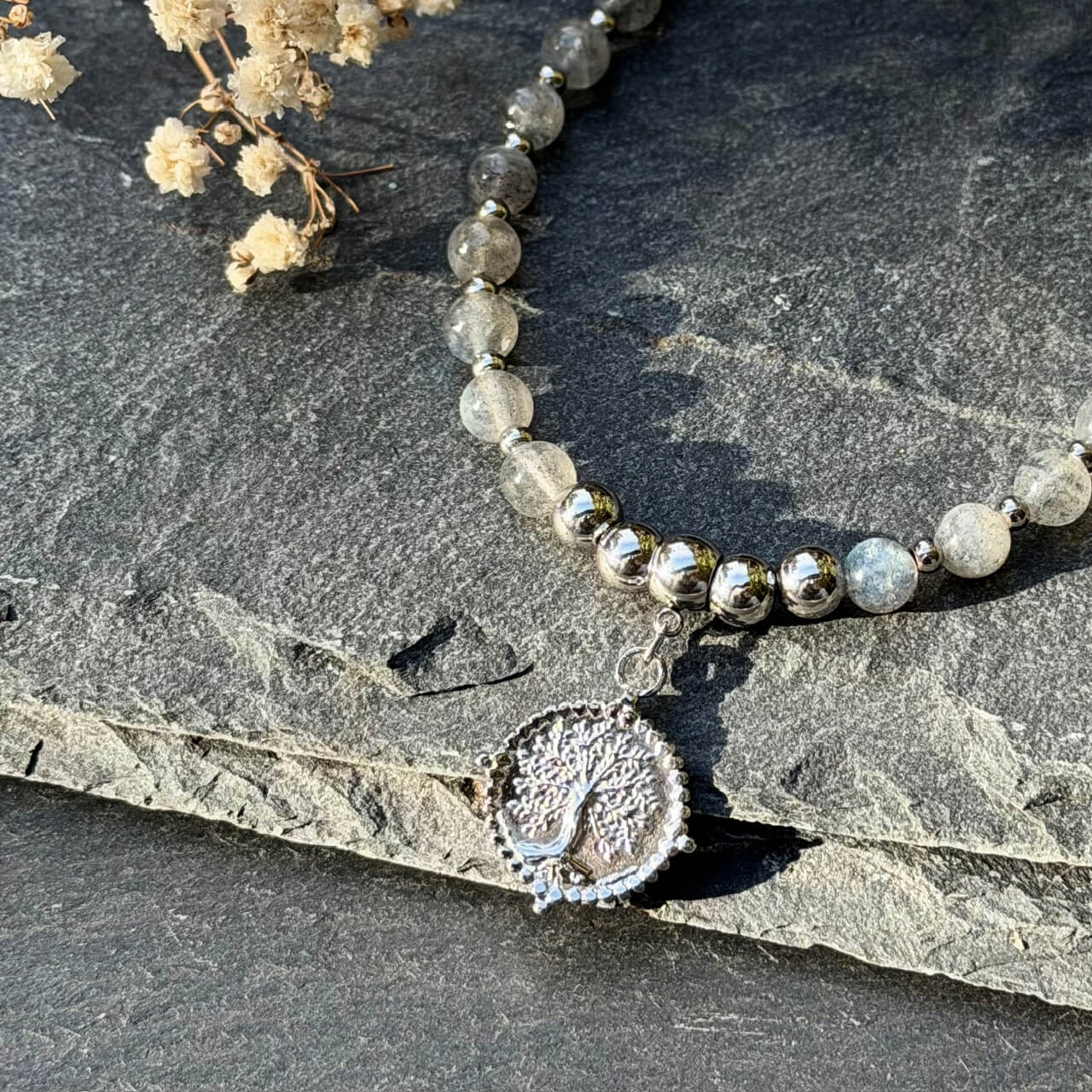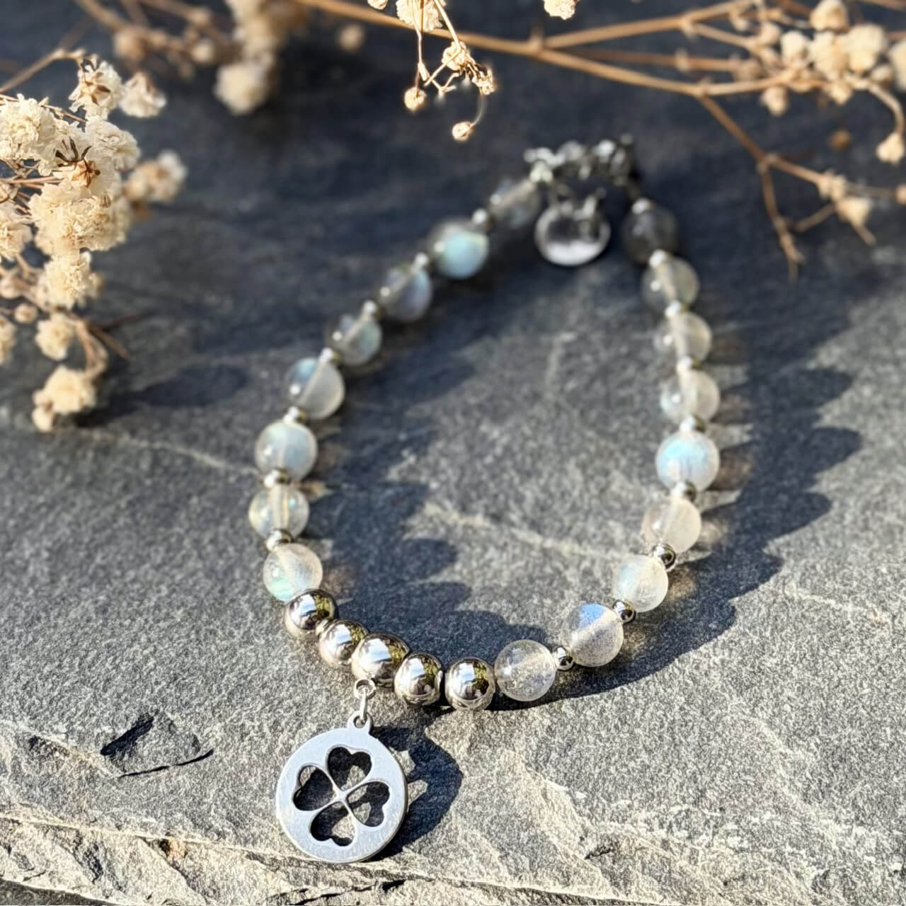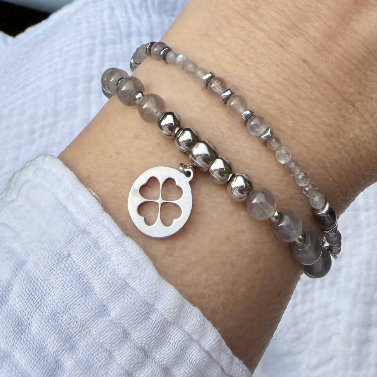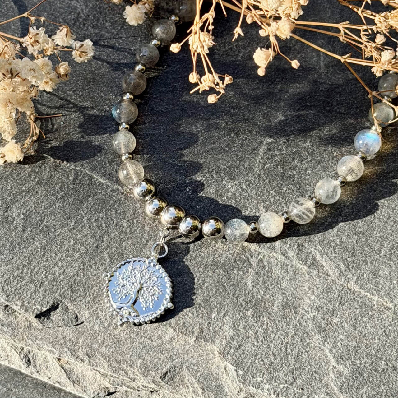 • Pierres naturelles : perles en labradorite non traitées (6 mm), aux magnifiques reflets bleutés et argentés.