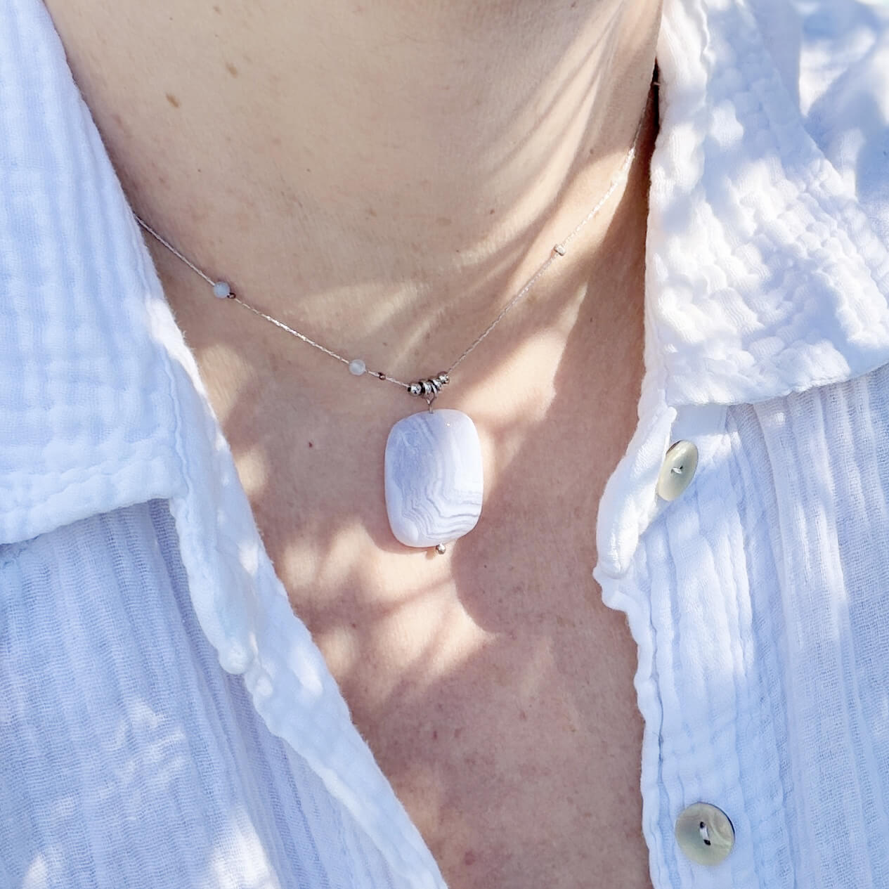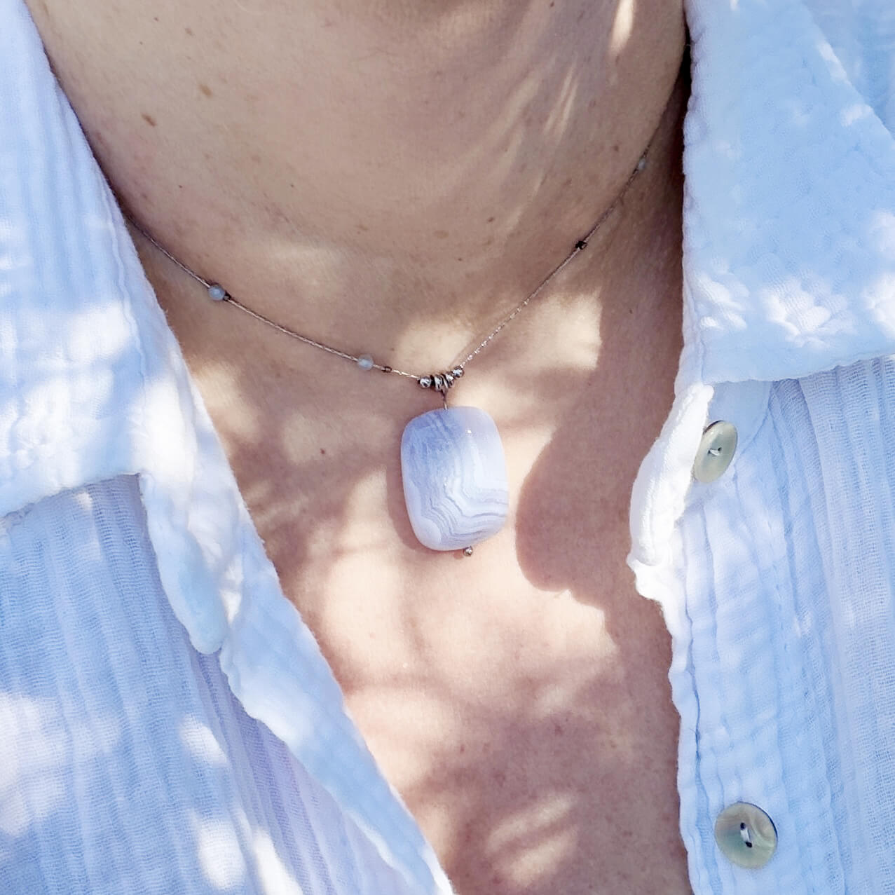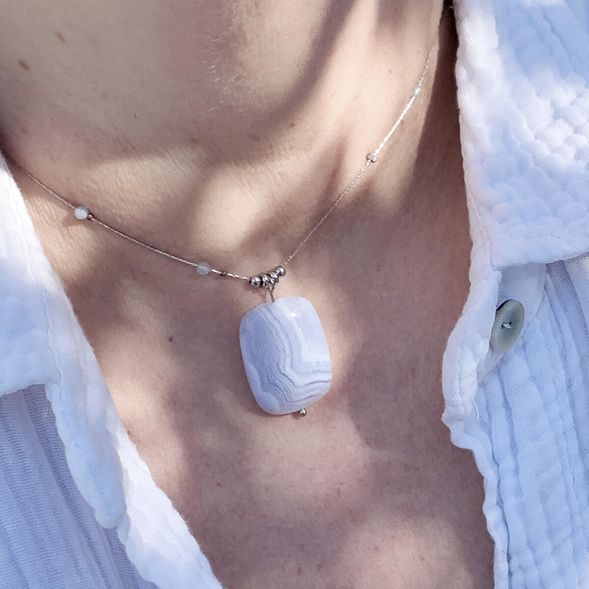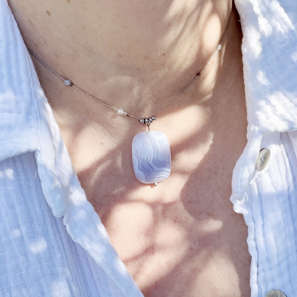 C’est précisément pour cela que ce collier en calcédoine naturelle a été créé. Pierre de douceur et de communication par excellence, la calcédoine agit sur les émotions et le mental. Elle apaise le stress, encourage la clarté d’esprit et aide à trouver les mots justes, ceux qui viennent du coeur.