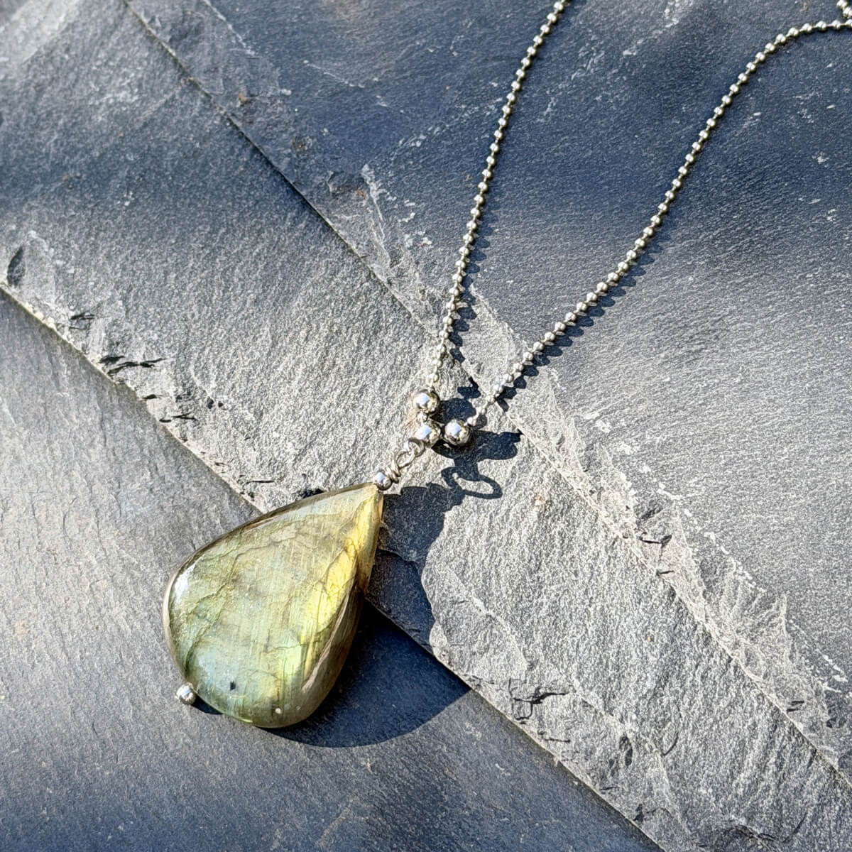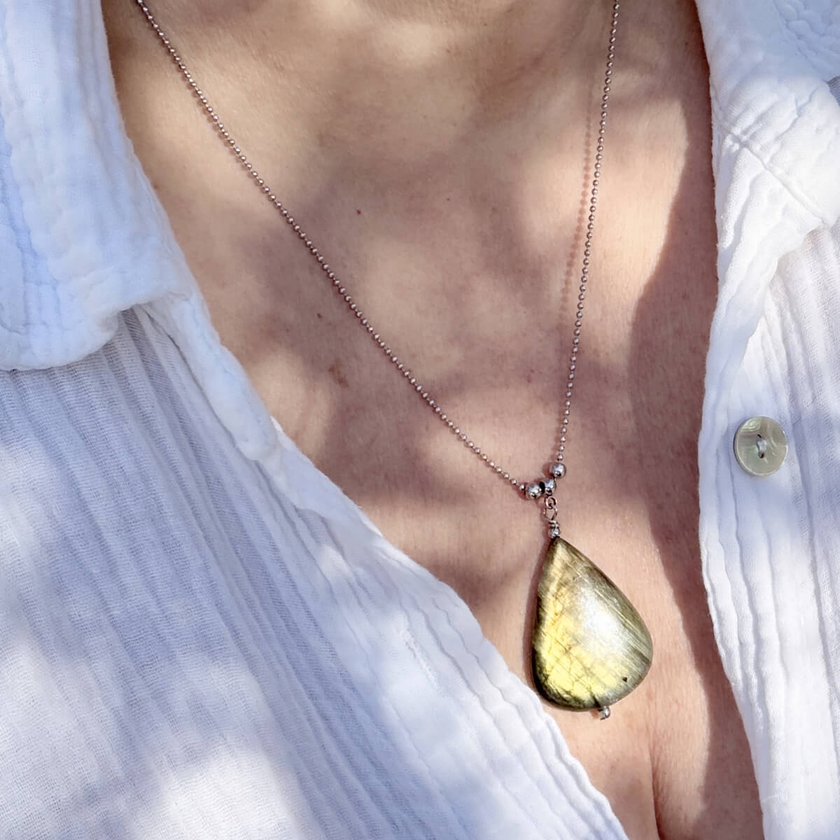 Ce collier en labradorite verte est entièrement réalisé à la main dans mon atelier à Bordeaux.
