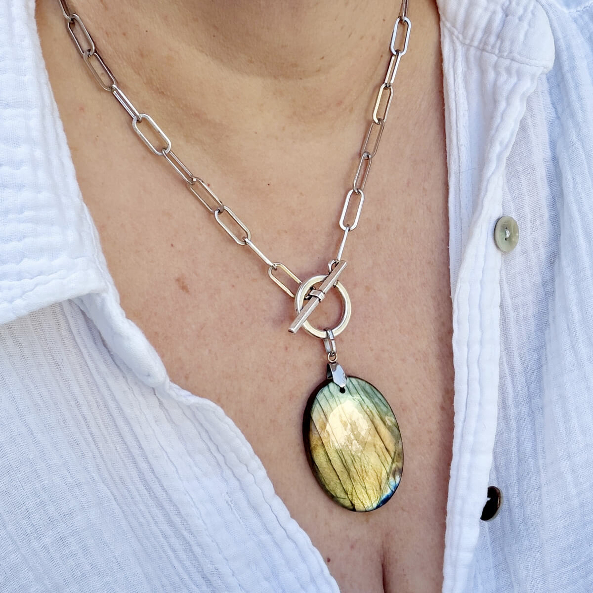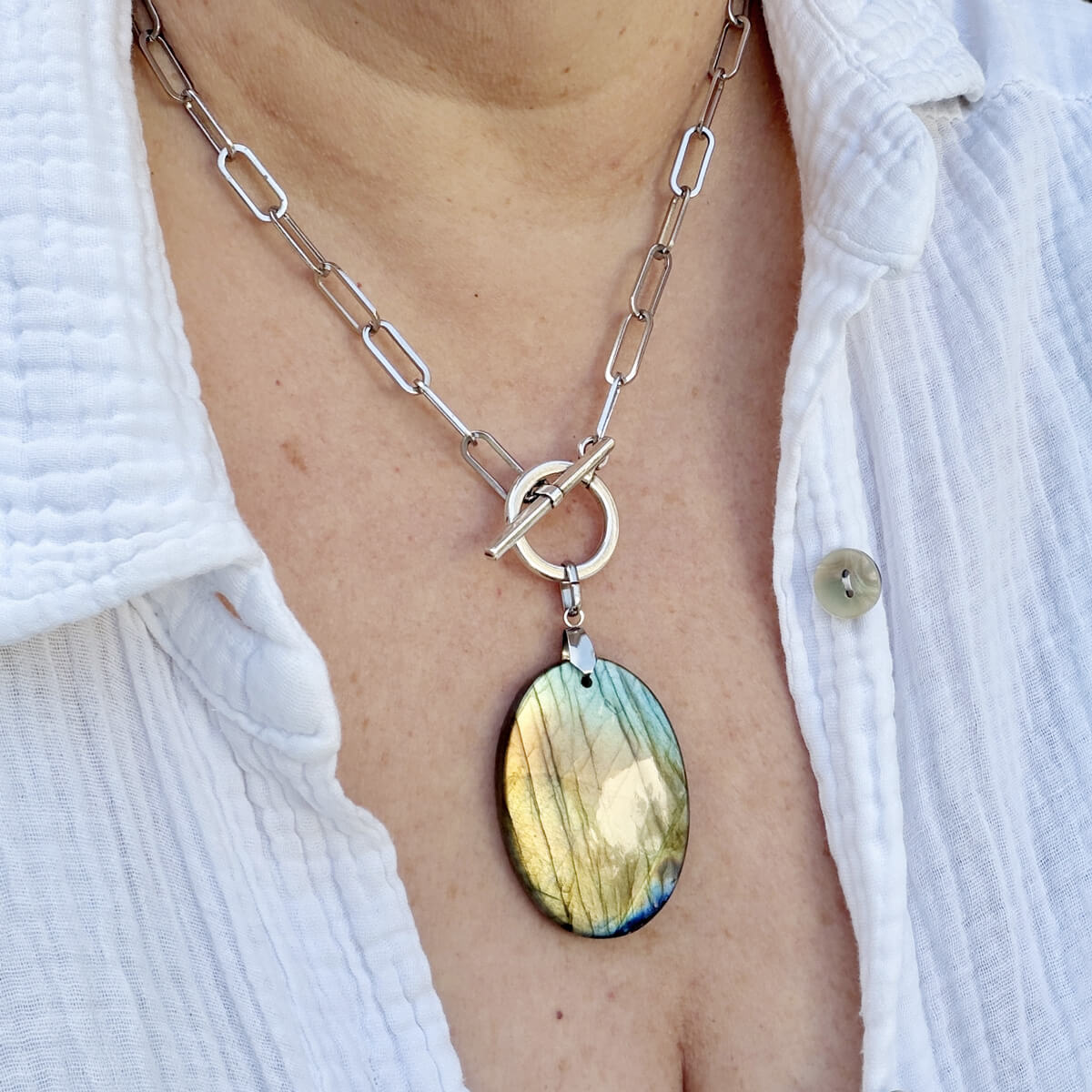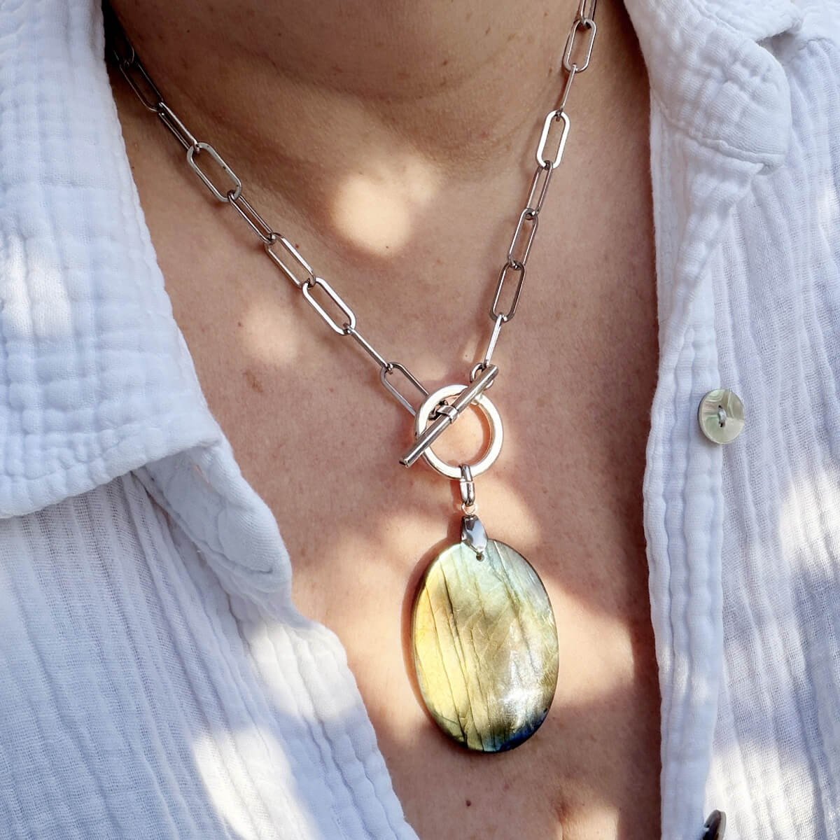 Ce collier en labradorite naturelle a été crée pour vous aider à retrouver votre équilibre intérieur et préserver votre énergie tout au long de la journée.