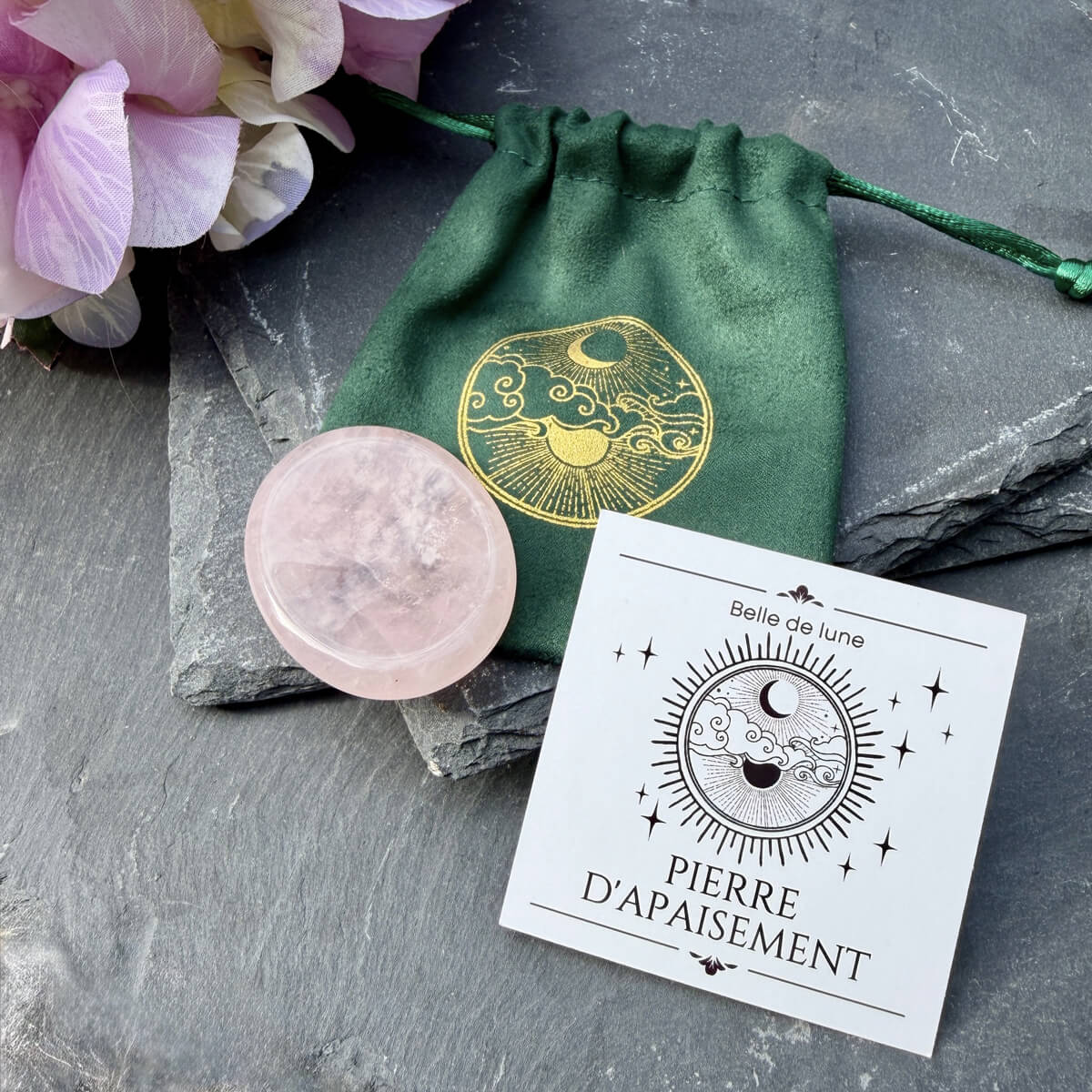 Votre pierre d’apaisement est soigneusement emballée dans son pochon Belle de lune, prête à offrir ou à s’offrir avec une carte explicative .